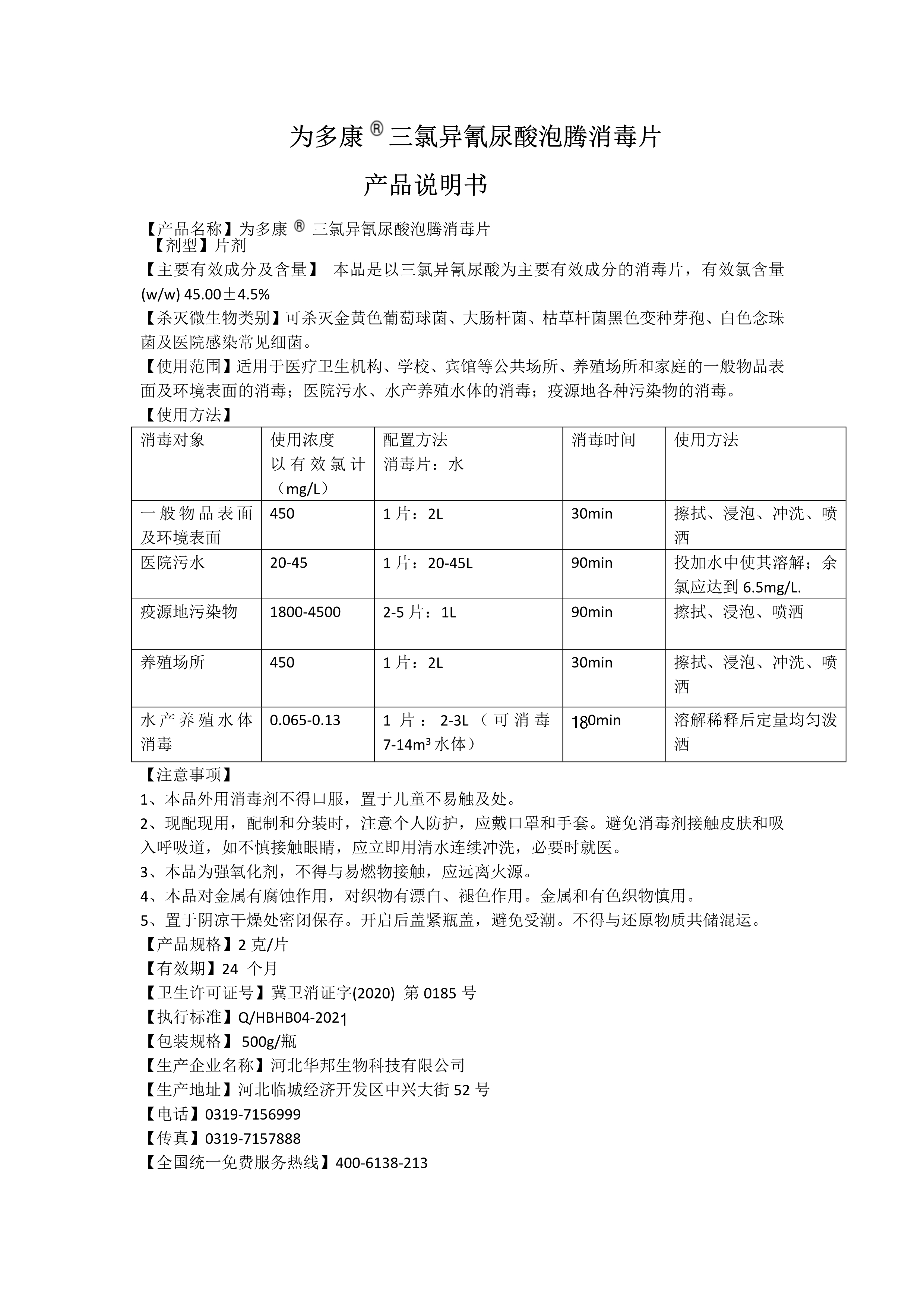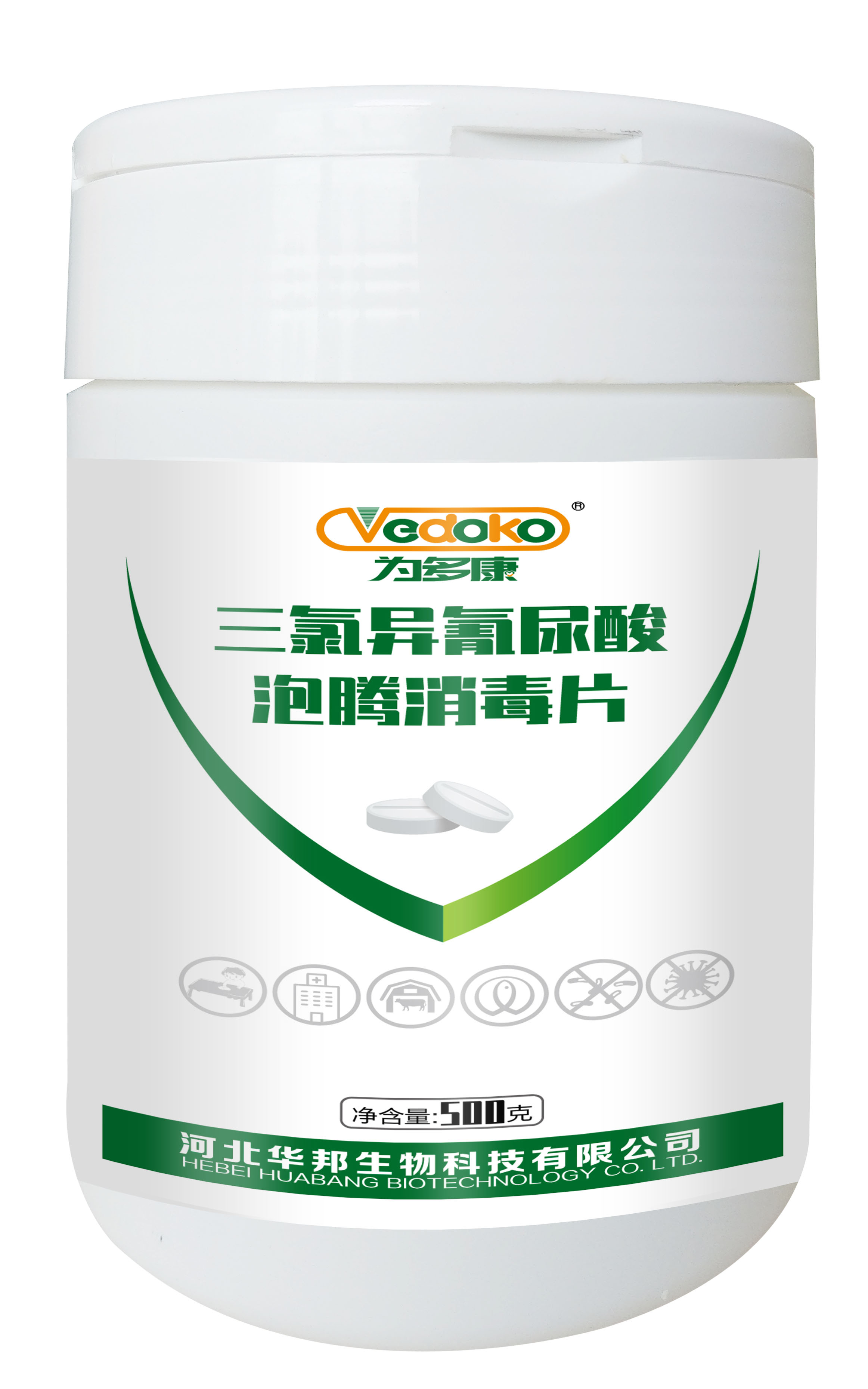 为多康®三氯异氰尿酸泡腾消毒片能迅速杀灭大肠肝菌,痢疾肝菌,真菌芽孢等各种致病性微生物具有广谱,高效,无毒,刺激性低,泡腾速溶,性质稳定,计量准确,操作简易,应用广泛等特点。
